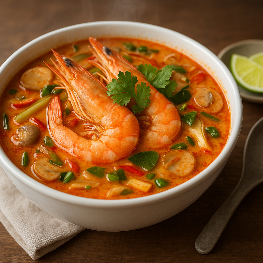Tom Yum Goong is a quintessential Thai soup known for its bold flavors and aromatic herbs. This hot and sour shrimp soup is a delightful blend of fresh ingredients that create a symphony of taste in every spoonful. What makes this dish truly special is the perfect balance of spiciness, tanginess, and umami, making it a favorite among Thai food lovers. For the best results, use fresh shrimp and herbs, and feel free to adjust the spice level to your preference. Enjoy it as a starter or as a comforting main dish served with rice.